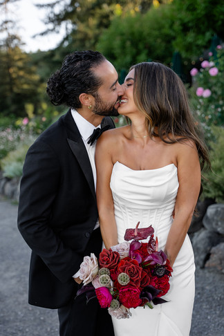 Guests arrived to a breathtaking ceremony space framed by a lush floral arch bursting with vibrant jewel tones—deep reds, purples, and touches of greenery. With the vineyard landscape as the backdrop, the couple exchanged vows under the clear Napa sky, creating a picture-perfect moment that felt both intimate and cinematic.